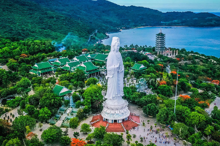 峴港有三座同樣名稱的「靈應寺」(Linh Ung Pagoda),各具特色、各有看頭,雖然歷史不算悠久,但卻都是到峴港旅遊的必訪景點。這三座「靈應寺」分別位在巴拿山、五行山,以及山茶半島上。 山茶半島以一座巨大觀音塑像引人耳目,高約70公尺,約20層樓高,是東南亞最高的觀音像。從美溪沙灘即可看到東北方山茶半島上,高聳矗立著純白色的觀音塑像。觀音塑像高踞於蓮花座上,內部分為17層樓,每一個樓層都有21尊佛雕,姿勢表情各異,展現精緻的工藝之美。 靈應寺廟宇腹地寬廣,院內種有各種花草、盆景,四季花開不斷。寺廟的正殿中間供奉釋迦牟尼佛像,通往正殿的路兩旁是排列整齊的18尊羅漢佛像,均由白玉雕刻而成,佛像表情神態逼真,栩栩如生,呈現喜怒哀樂不同樣態的神情。